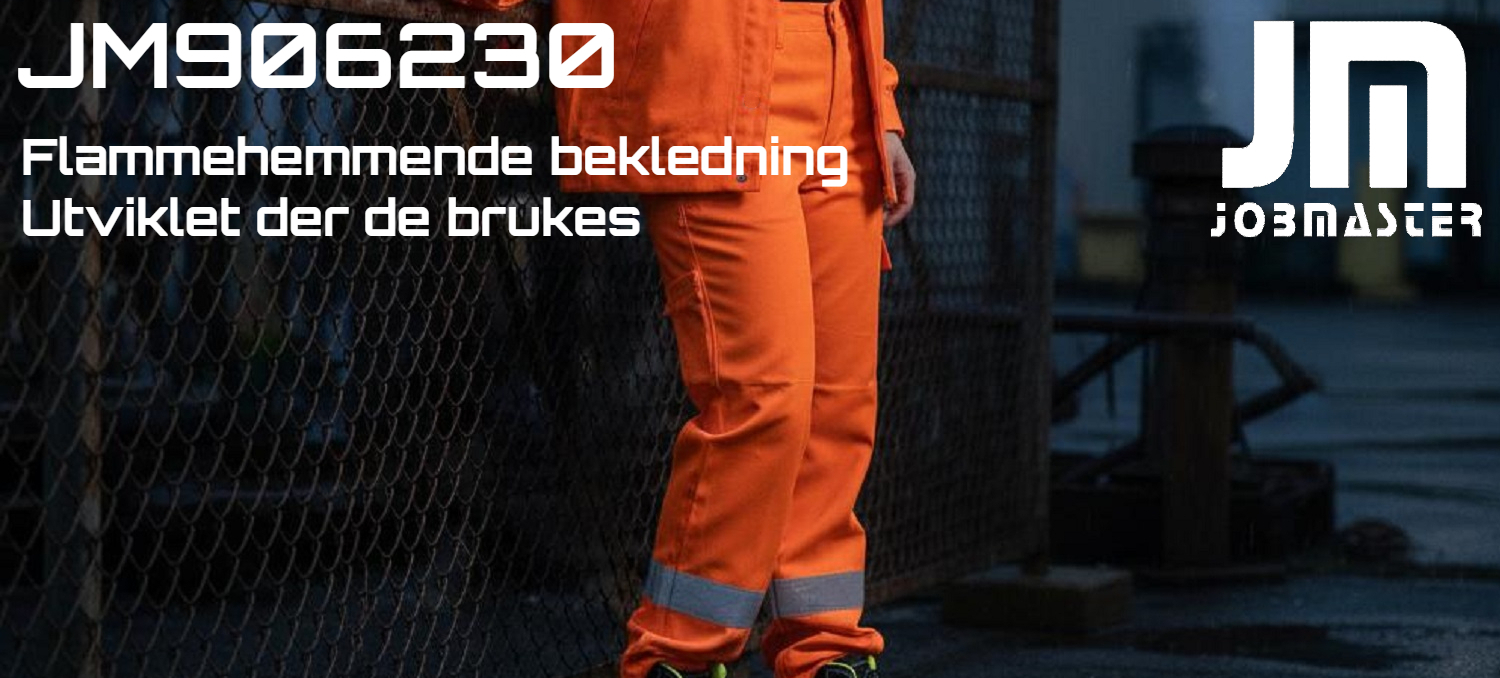 JM 906230 Antiflame bukse produsert i 350gr. Øko-Tex 100 metervare som er 99% bomull/1% AS Castor Xinke Protective. Antistatisk pyrovatexbehandlet materiale som er flammehemmende i hele plaggets levetid. Buksen leveres med YKK glidelås og 50mm reflekser.