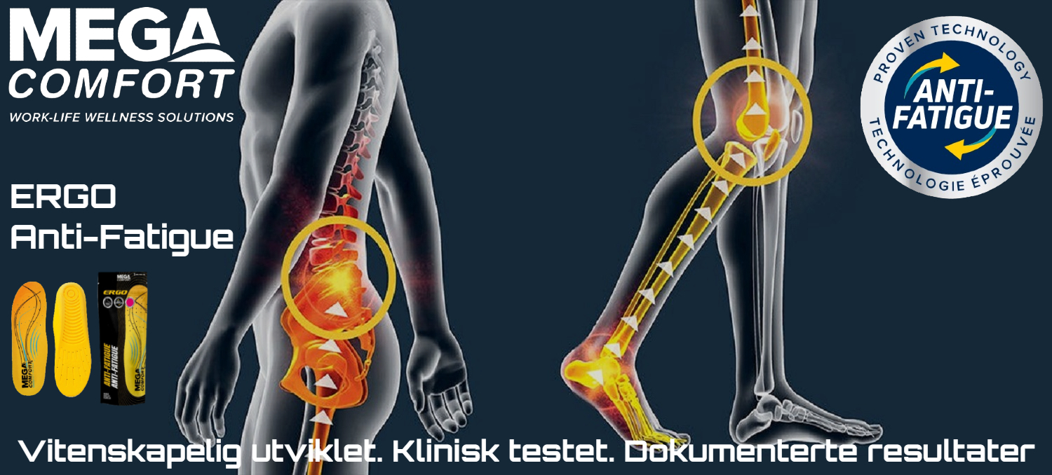 Megacomfort Ergo Anti-Fatigue er produsert i patentert 100% HD minneskum. Noe som gir optimal stabilitet, demping og suveren brukerkomfort. Anti-Fatigue gir maksimal brukeropplevelse og resultat i fottøy, noe som gjør dem langt mer effektive enn f.eks. standard gulvmatter for å redusere muskelbelastning og for å forbedre balansereaksjoner. Sålen består av to lag, og er spesiallaget for bruk i verne-/yrkesskosko, og perfekt for vernefottøy med tåbeskytter fordi minneskumet komprimeres for sikker klaring fremme ved tåen. Men sålen fungerer også optimalt i de aller fleste fritidssko. Ideell for både stasjonære og mobile jobber, og for både utendørs og innendørs arbeid. Inneholder antibaktrielle stoffer som motvirker vond fotlukt og svette.