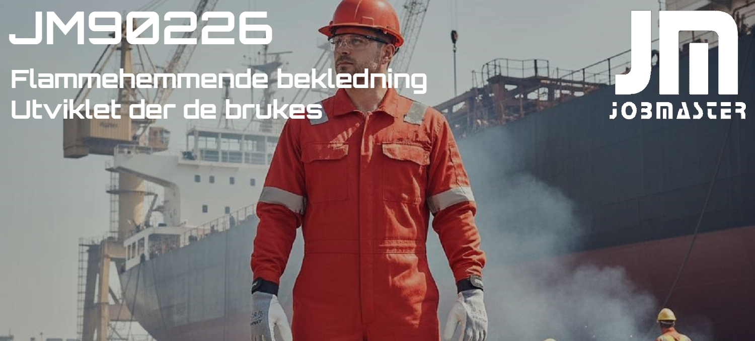 JM 90226 Antiflame kjeledress produsert i 350gr. Øko-Tex 100 metervare som er 99% bomull/1% AS Castor Xinke Protective. Antistatisk pyrovatexbehandlet materiale som er flammehemmende i hele plaggets levetid. Kjeledressen leveres med metallknapper og 50mm reflekser.