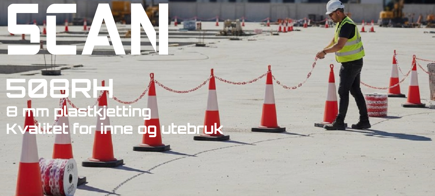 Rød/hvit 8 mm solid plastkjetting på spole for inne- og utebruk. Til avgrensning, sikring og markering av bl.a. arbeidsområder, innhegninger, parkeringsplasser, messer, sportsarrangementer osv. Fargefast og UV-bestandig. Lett og sterk. Selges i hele spoler.
