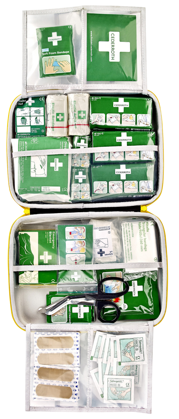 En førstehjelpspakke av slitesterkt materiale som beskytter innholdet mot støv og fuktighet. Gripevennlig håndtak. Gjennomsiktige plastlommer gir god oversikt over innholdet. Det er plass til ekstrautstyr i kofferten.