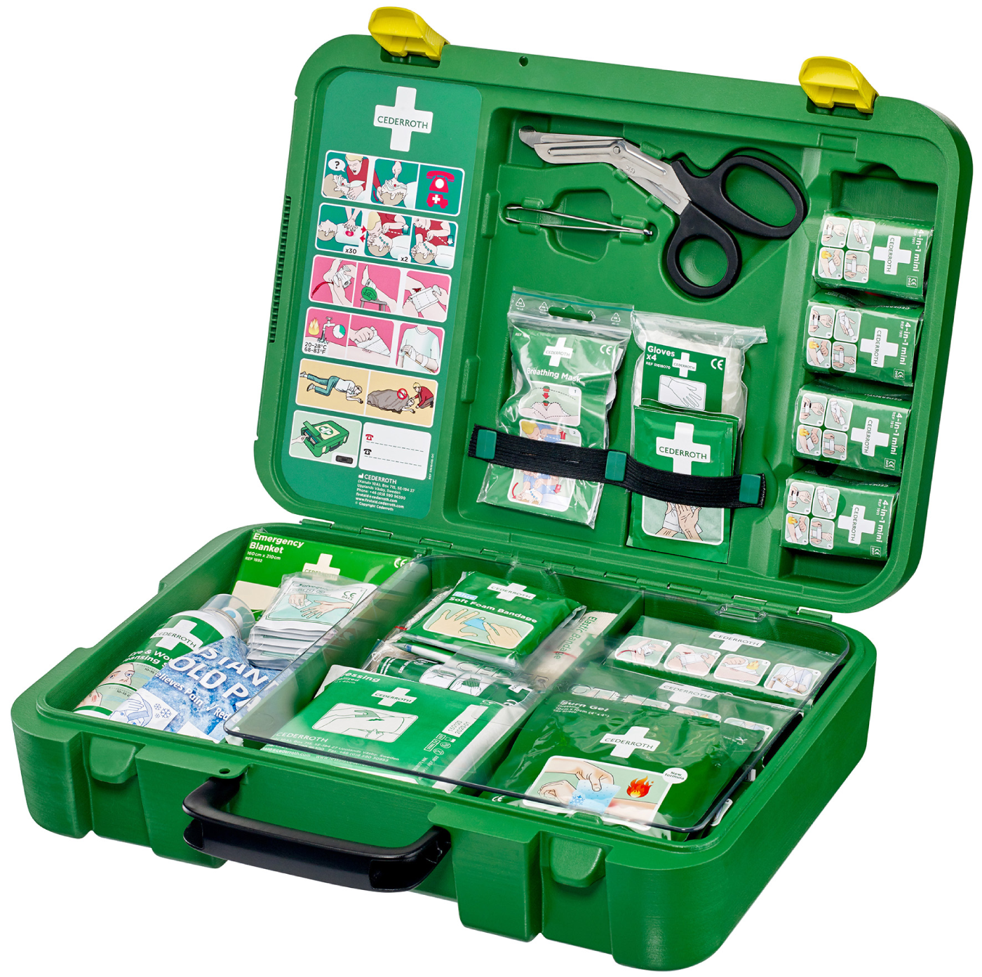 Robust og solid Førstehjelpssett i hardplast med plasterautomat på utsiden. Vesken beskytter mot støt, støv og fukt. Tydelig oversikt medbl.a. hansker, saks og pustemaske i lokket. Røde refillmerker viser når det er på tide å fylle på. Signalfarger i grønt og gult gjør vesken synlig på lang hold. Plass til øyedusj eller etter tillegg.